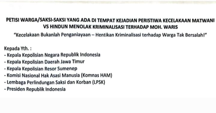 “Namun sangat mengejutkan dan tidak masuk akal, bahwa Moh Waris, warga yang tidak melakukan kekerasan fisik apa pun, justru ditetapkan sebagai tersangka penganiayaan terhadap Matwani,” tulis petisi tersebut dikutip pada Rabu (9/7/2025).