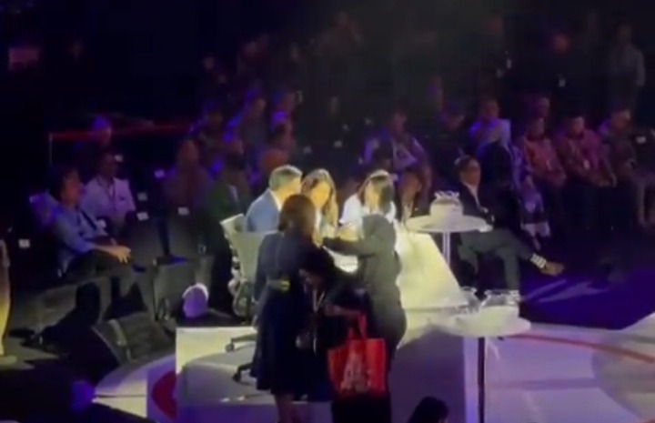 Rilpolitik.com, Jakarta – Wakil Ketua Dewan Pembina Partai Solidaritas Indonesia (PSI) Grace Natalie dan Anggota Dewan Pembina PSI Isyana Bagoes Oka menghampiri moderator debat ketiga Pilpres 2024 saat jeda segmen kedua di Istora Senayan, Jakarta pada Minggu (7/1/2024). Hal itu menuai tanda tanya publik atas tindakan keduanya.