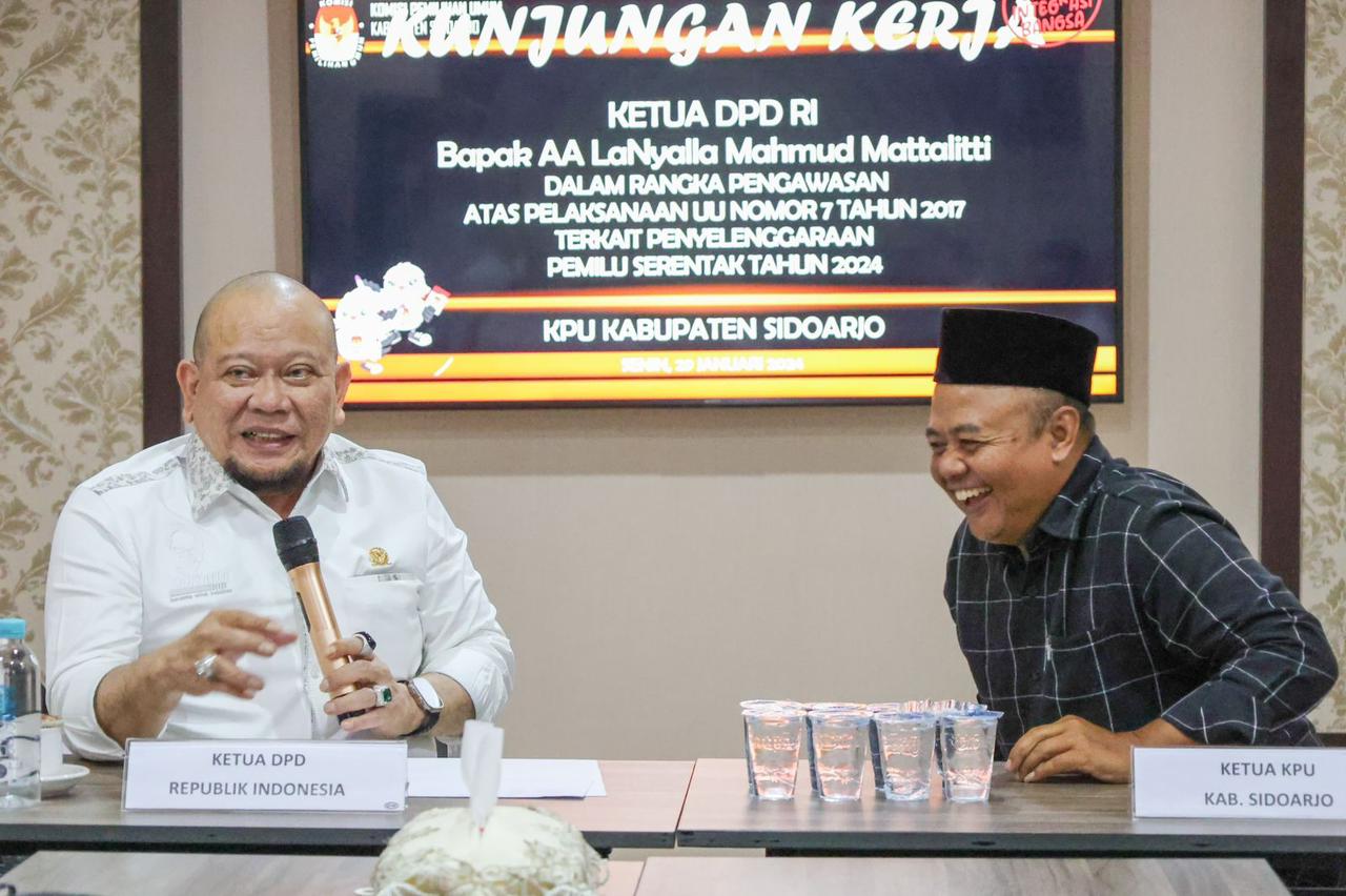 Rilpolitik.com, Surabaya – Ketua DPD RI, AA LaNyalla Mahmud Mattalitti berkesempatan mengunjungi Kantor KPUD Kota Surabaya dan Kabupaten Sidoarjo. Kunjungan kerja dalam rangka pengawasan atas pelaksanaan pemilu serentak tahun 2024 yang diemban Komite I DPD RI itu dimaksudkan untuk melihat lebih dekat persiapan yang sudah dilakukan jajaran KPU di daerah, khususnya di Jawa Timur.